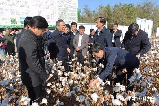 10月11日,中国农业科学院党组书记陈萌山与新疆维吾尔自治区副主席张春林一起考察了国家棉花产业联盟昌吉优质棉示范基地。