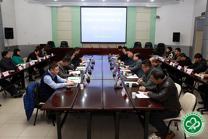 2017年12月12日,新疆生产建设兵团第七师师长、党委副书记赵志江,副师长、党委常委马新平等一行5人来所调研,并就进一步深化合作进行座谈交流。所长李付广、党委书记吕春生、副所长侯志勇和张西岭出席座谈会。