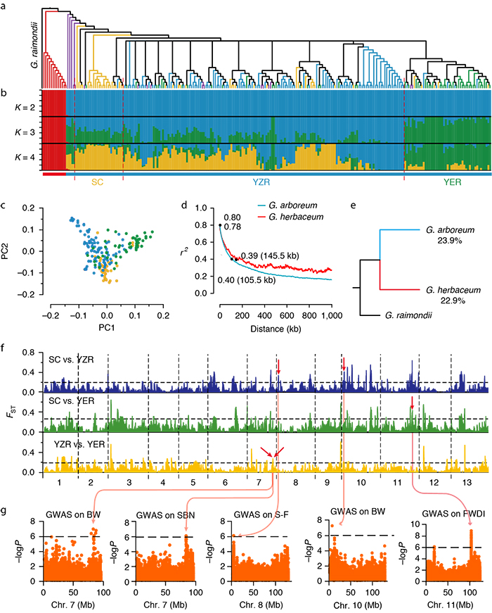 Resequencing of 243 diploid cotton accessions based on an updated A genome identifies the genetic basis of several key agronomic traits”的文章。该研究结合群体遗传学,全基因组关联分析和分子生物学等技术,首次从基因组水平上明确了亚洲棉在中国的演化,遗传多样性和群体结构特征,获得了一批重要性状关联的标记和基因,并发现抗枯萎病、生育期等性状受到地理分化的选择。