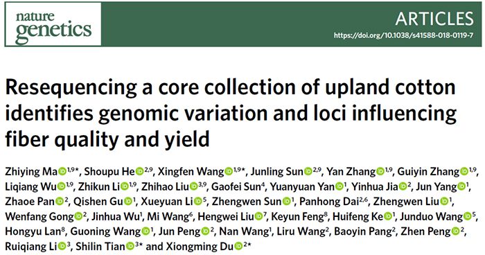 Resequencing a core collection of upland cotton identifies genomic variation and loci influencing fiber quality and yield”的陆地棉研究成果。该研究首次利用我国419份陆地棉核心种质发掘了约366万个SNP标记,对陆地棉核心种质群体的遗传多样性和群体结构进行了系统分析,本研究的主要亮点是完整地搜集了13个纤维相关性状在12个环境中的表现,利用全基因组关联分析(GWAS)发掘了一大批重要性状相关的位点和基因,并对部分关键候选基因进行了功能验证。