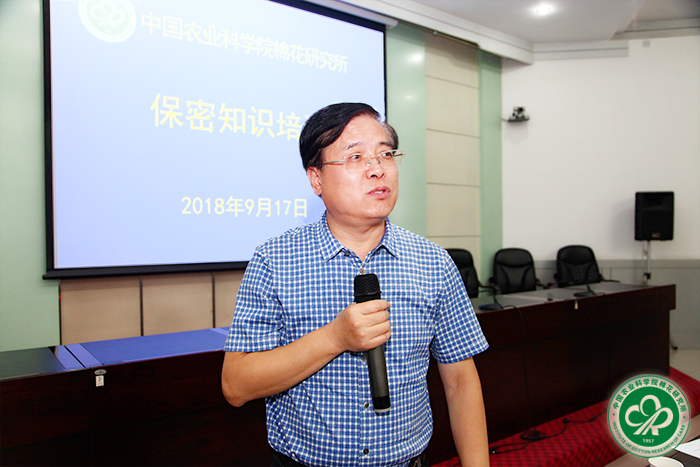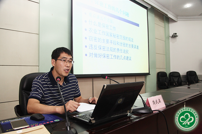 樊武森对保密工作的含义、农业工作相关保密规定、窃密的主要手段和泄密的主要渠道等进行了解读,结合大量实际案例和多年工作经验,分析了保密工作面临的严峻形势。此外,他结合我所实际,讲解了计算机网络、涉密人员、出国境和项目保密管理工作重点,并提出了意见和建议:一是要加强保密工作的领导,增强保密工作组织保障;二是加强保密法律法规的宣传教育,强化保密工作思想保障;三是严格落实保密工作基本制度,完善保密工作制度保障。随后,与会人员集中观看了保密专题教育片《红线不能触碰,底线不能逾越:保密法第四十八条背后的案例故事》。