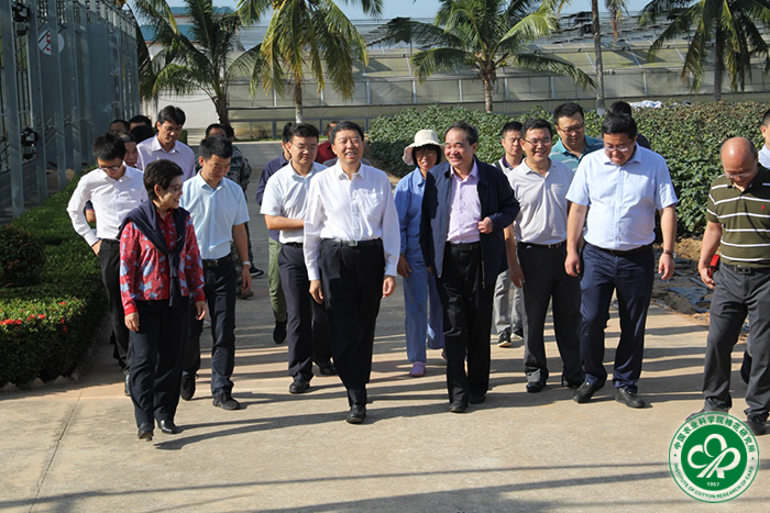 中棉所副所长张西岭、计划财务处处长马雄风、品种资源研究室主任杜雄明及海南科研中心相关人员陪同调研。(摄影:张鹤)