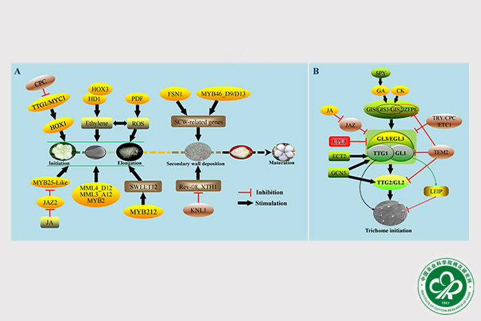 A:棉纤维发育中关键转录因子及其作用途径;B:拟南芥表皮毛起始发育中的关键因子及其作用机制