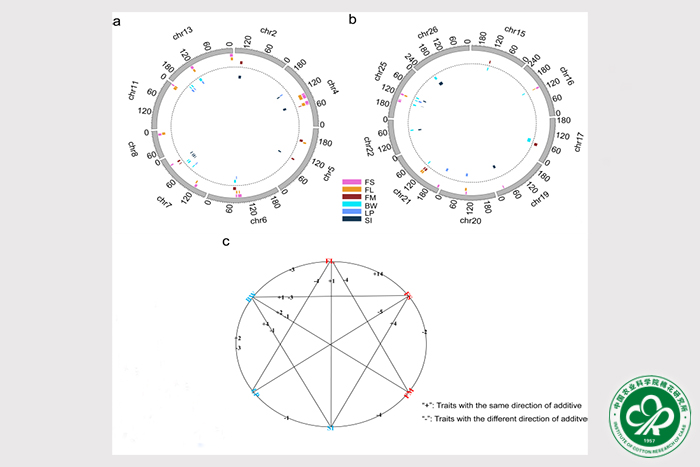 该图主要展示了本研究定位到的QTL Cluster在陆地棉基因组上的分布情况,以及QTL加性效应与性状之间相关性的关系。