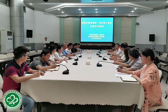 为迎接新中国成立70周年,深入开展“讲述部史部风 牢记初心使命”主题教育活动,2019年8月5日,科研第二党支部与安阳市农科院第六党支部联合开展“弘扬中棉所精神,牢记初心使命”主题党日活动。