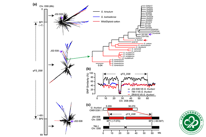 现有陆地棉品种遗传基础比较狭窄,限制了其纤维品质的进一步改良。棉属中丰富的品种资源为陆地棉育种和遗传改良提供了遗传物质基础,种间杂交策略在棉花育种过程中得到了广泛应用。在种间杂交育种过程中,严重偏分离的标记常常由于不符合遗传作图分析中假设的标准分离比而被剔除,由此可能会错失与生物关键遗传特性有关的含偏分离标记的染色体区域。该研究发现超级优质纤维种质J02-508(纤维强度>38 cN/tex)的D08染色体上一个大片段区间(7.073-60.027 Mb)存在严重的偏分离现象,进一步研究发现在该区间有一个与纤维强度显著相关的稳定QTL。随后研究人员利用3227份棉花材料的重测序数据,确定了J02-508材料中D08染色体该区间来自二倍体野生棉瑟伯氏棉(D1),与群体中标记偏分离现象和纤维强度性状相关。