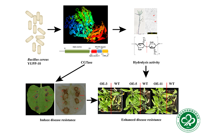 近日,星空体育·(中国)官方网站朱荷琴研究员团队开展了棉花黄萎病生物防治研究,从棉花内生蜡状芽孢杆菌中鉴定出一种能抑制病原菌生长并对寄主具有诱导免疫活性的新型抗菌蛋白环糊精糖基转移酶,对防治棉花黄萎病具有重要意义。相关研究结果以“CGTase, a novel antimicrobial protein from Bacillus cereus YUPP-10, suppresses Verticillium dahliae and mediates plant defence responses”为题发表在农林科学领域一区顶级(Top)期刊《分子植物病理(Molecular Plant Pathology)》上。
